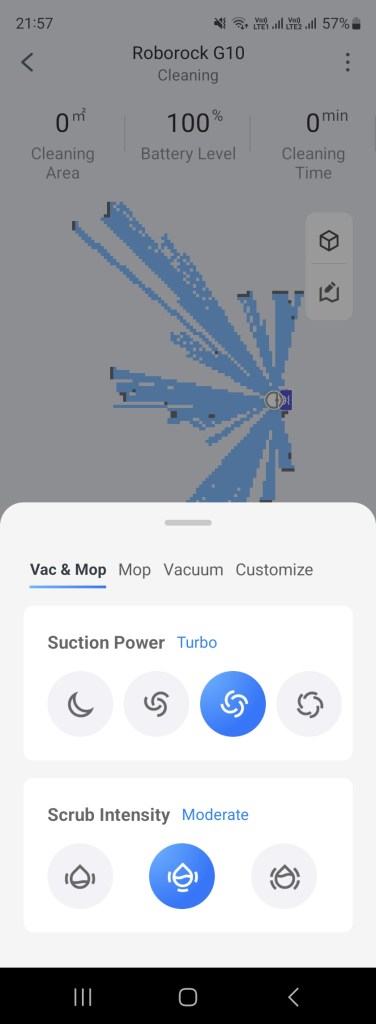 I first tested the wash setting before setting it to do a clean cycle, thinking that like the Q7 and S7 models, it’s better to wet the wash mop beforehand, otherwise, the mop would run for a few minutes without being fully wet, leaving you with some unmopped areas. However, that’s not necessary for the G10, as the first thing the unit does upon being set to clean, is to wash the mop, so anytime the G10 is set to clean, it’ll begin with a clean, wet mop.