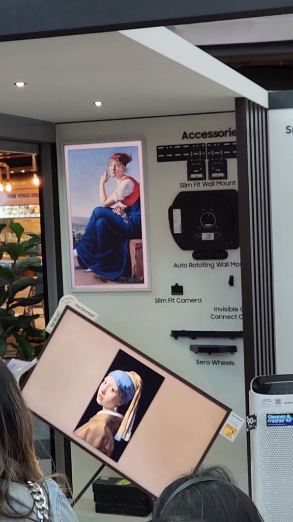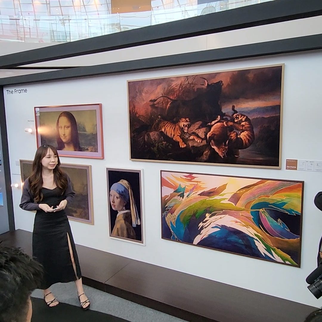 Samsung also displayed some upgrades to their popular Samsung Frame line of TVs, with a new metal bezel frame edge, and auto-rotating wall mounts to flip the Frame TV from horizontal to landscape and vice versa.